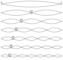 Eine Gitarrensaite schwingt nicht nur in seiner gesamten Länge auf und ab (Grundschwingung), sondern auch in ihren Teillängen 1/2, 1/3, 1/4, ... (diese bilden die Oberschwingungen).