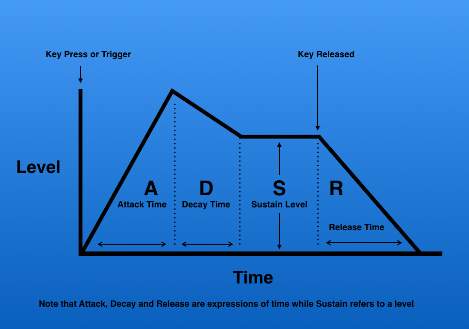 - Sustain: Höhe des konstanten Niveaus (Intensität, solange die Taste gedrückt gehalten wird)