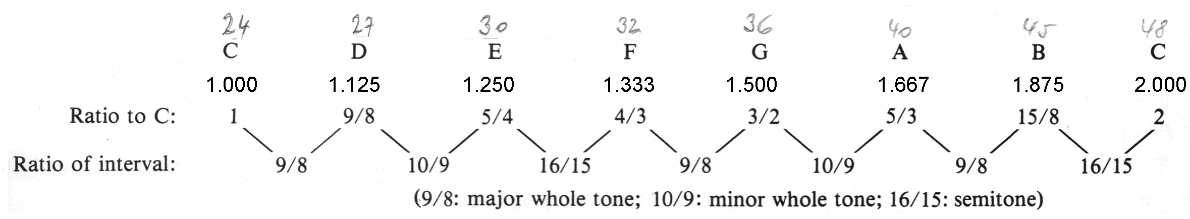 Aus dem Tonvorrat der ersten Obertöne sowie nach dem Prinzip der einfachen Frequenzverhältnisse lässt sich von jedem Grundton aus eine Tonleiter aufbauen, z.B. die Dur-Skala. Nimmt man als Grundton z.B. den Ton C, so erhält man die "reine" C-Dur-Tonleiter mit folgendem Aufbau (Hinweis: im Englischen wird der Ton H mit B bezeichnet):