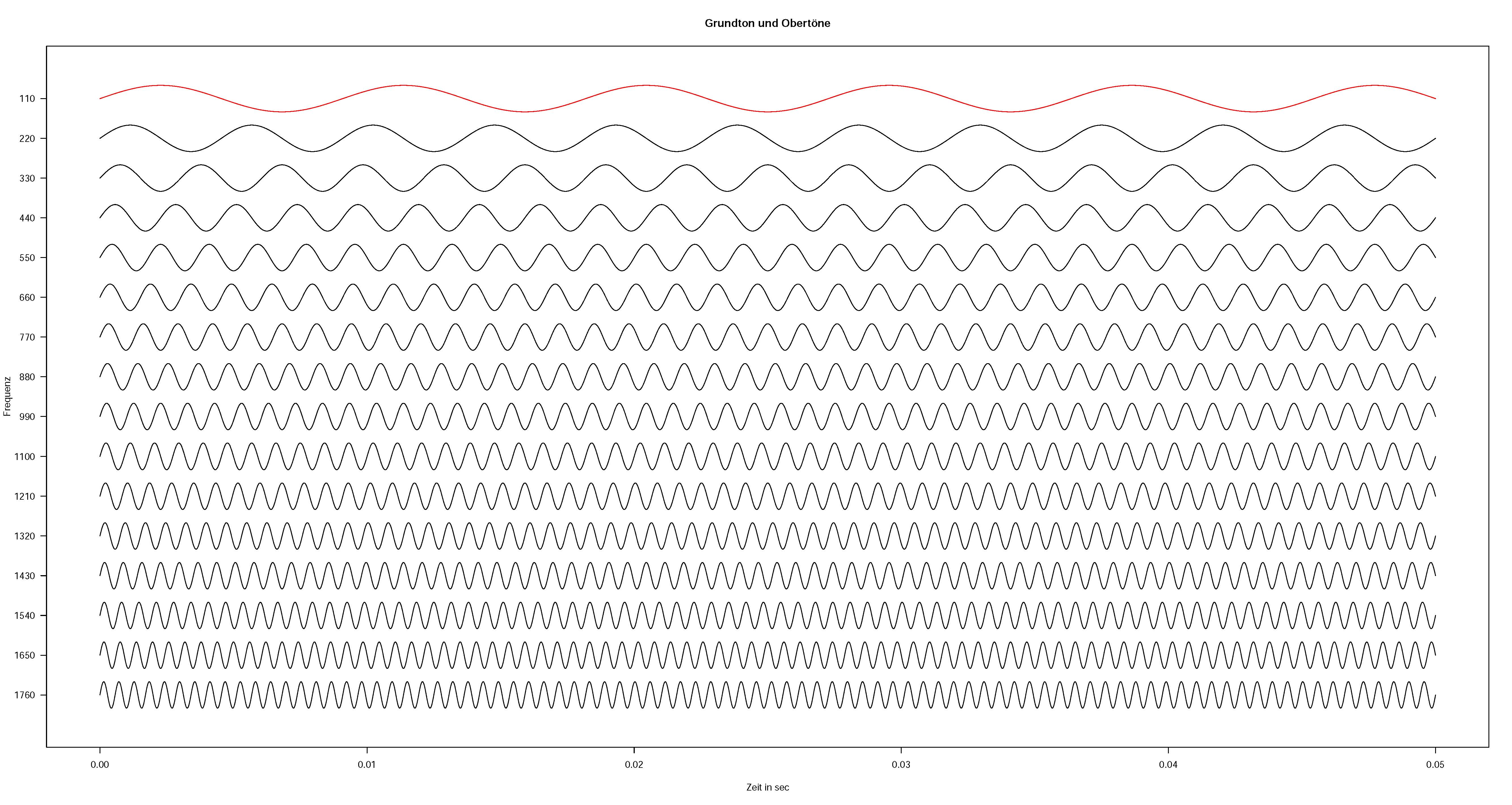 Generell kann jede beliebige periodische Funktion (d.h. auch jede beliebige Schallwelle) als simultane überlagerung von verschiedenen Sinuswellen dargestellt werden. Das mathematische Verfahren dafür ist die sog. "Fourieranalyse". Ein Ton eines Musikinstruments (oder eines Sängers) ist also eindeutig darstellbar als Verschmelzung von vielen Tönen, als Überlagerung eines Grundtons mit Obertönen, deren Frequenzen ganzzahlige Vielfache der Grundfrequenz (f0, Frequenz des Grundtons) sind.