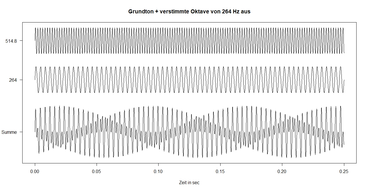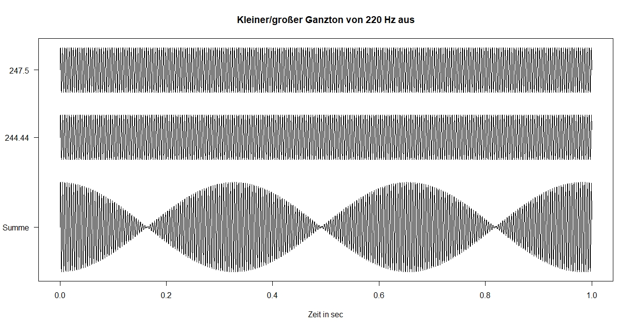 Die Schwebung beim Hör-Vergleich der Ganztöne (s.o.) sieht man deutlich in der folgenden Graphik: