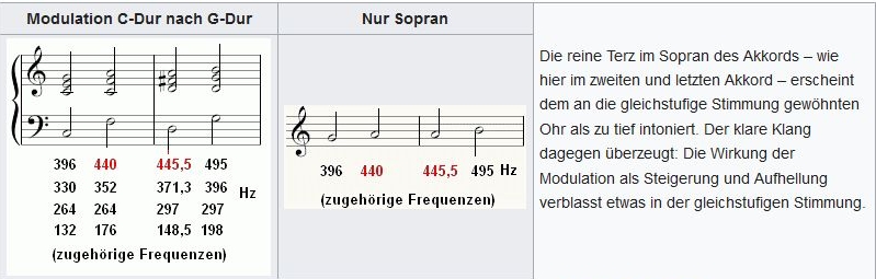 Anhören: 7 Oktaven - 12 Quinten 🔈 - Der Vorteil der reinen Stimmung liegt in der Reinheit des Klanges, der Nachteil hingegen liegt in der fehlenden Möglichkeit für Modulationen (Tonartwechsel).
