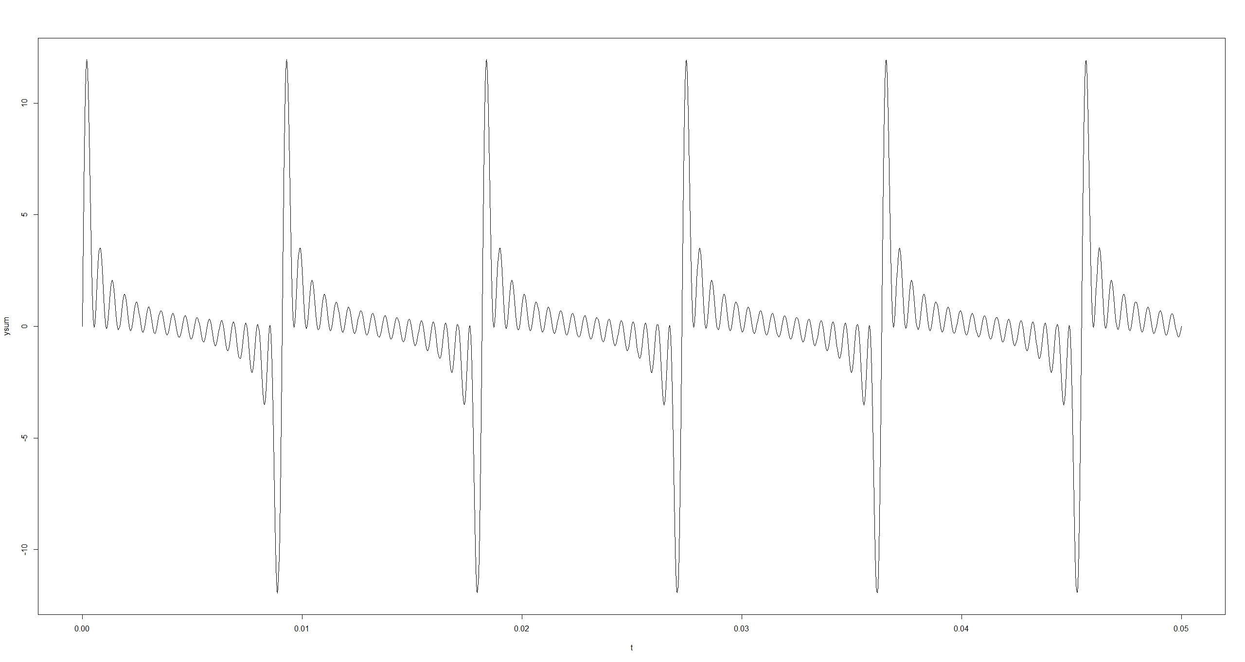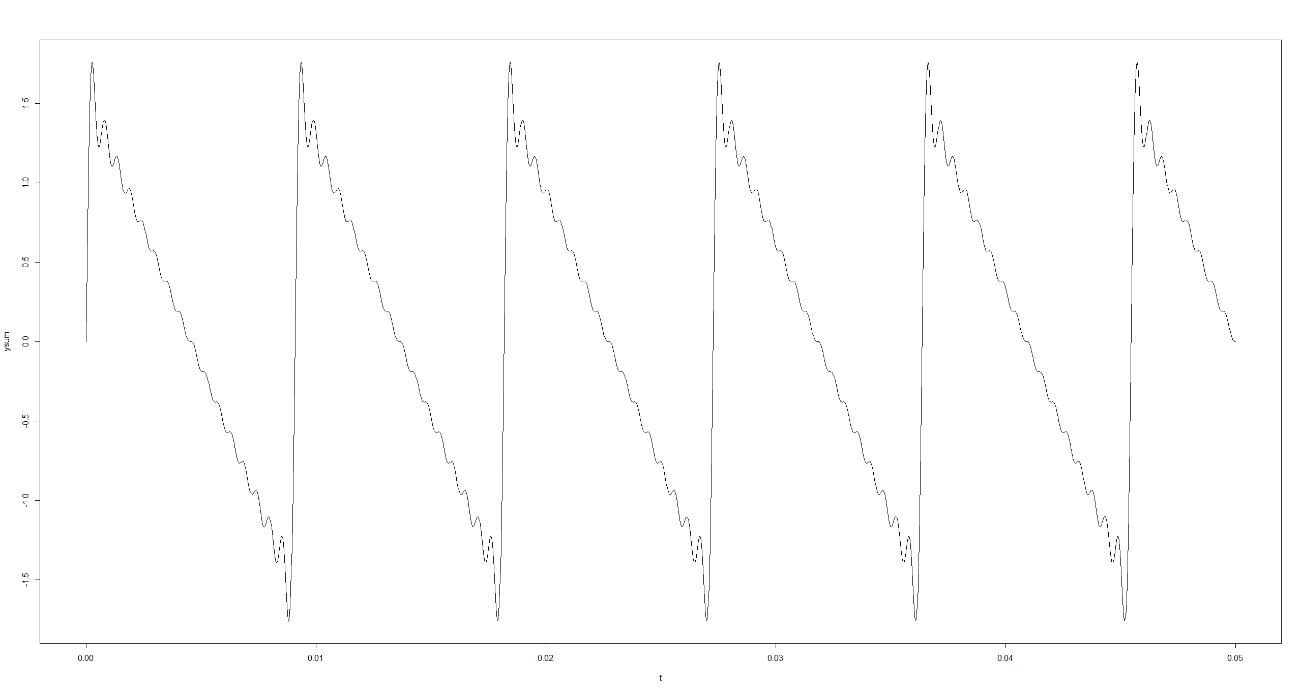 hier mit den Gewichten 1, 1/2, 1/3, 1/4, 1/5, ... . Damit ändert sich das Bild und der Klang (das Ergebnis ist die Sägezahnfunktion):