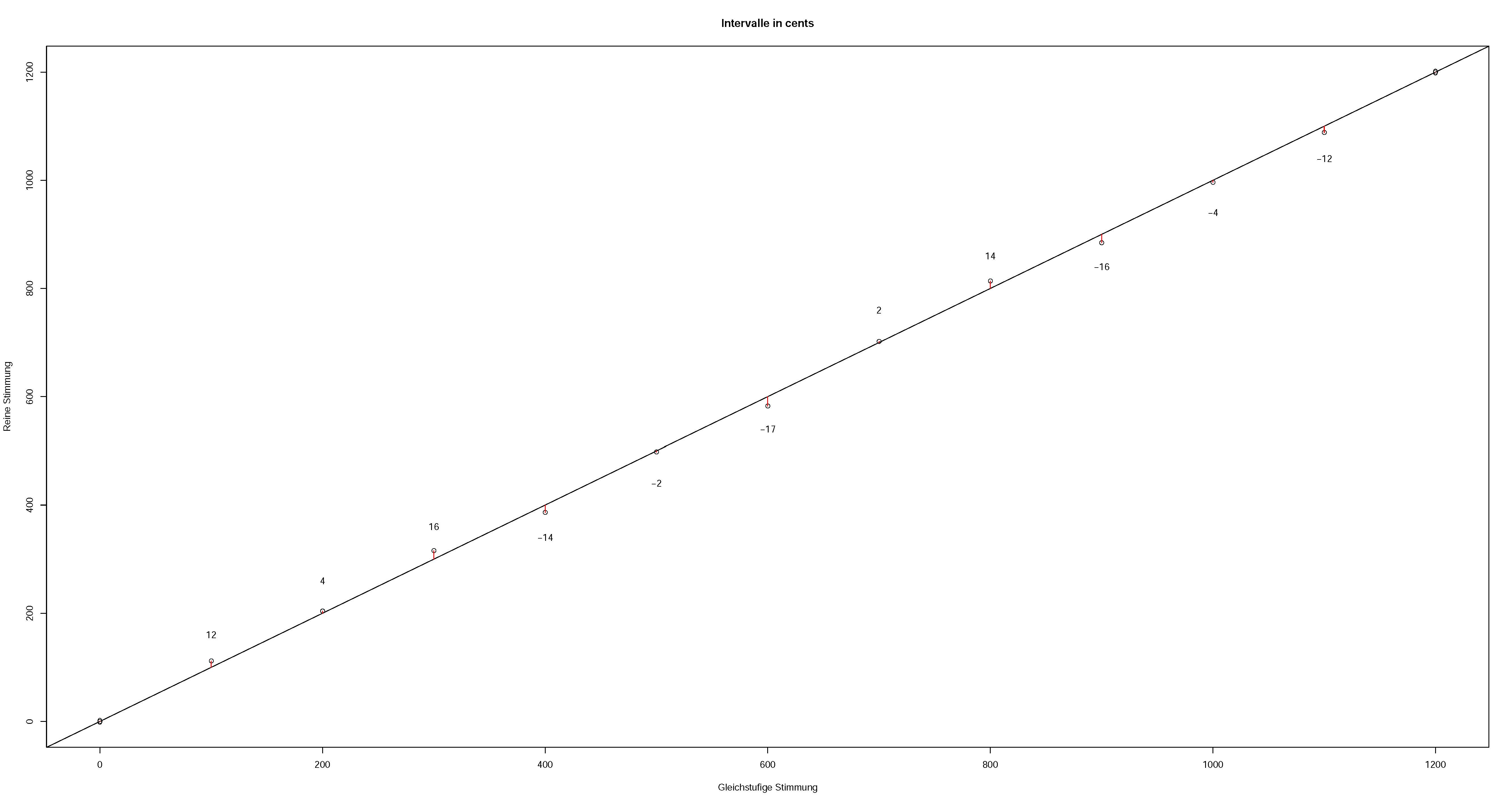 Schwebungsfrei, d.h. identisch bei beiden Stimmungen, sind nur die Prim und die Oktave. Bei Terz, Sexte und Septime ist die Schwebung recht groß, d.h. bei diesen Intervallen gibt es relativ große Unterschiede zwischen der gleichstufigen und der reinen Stimmung.