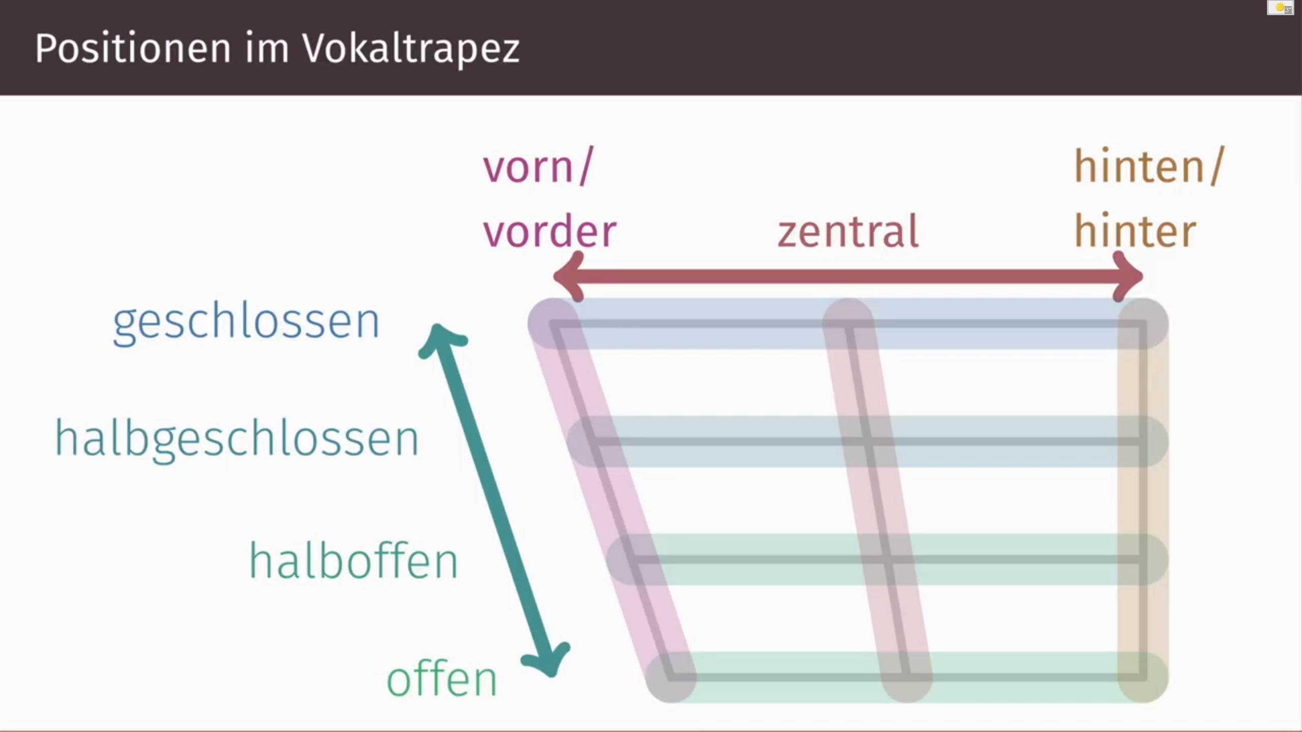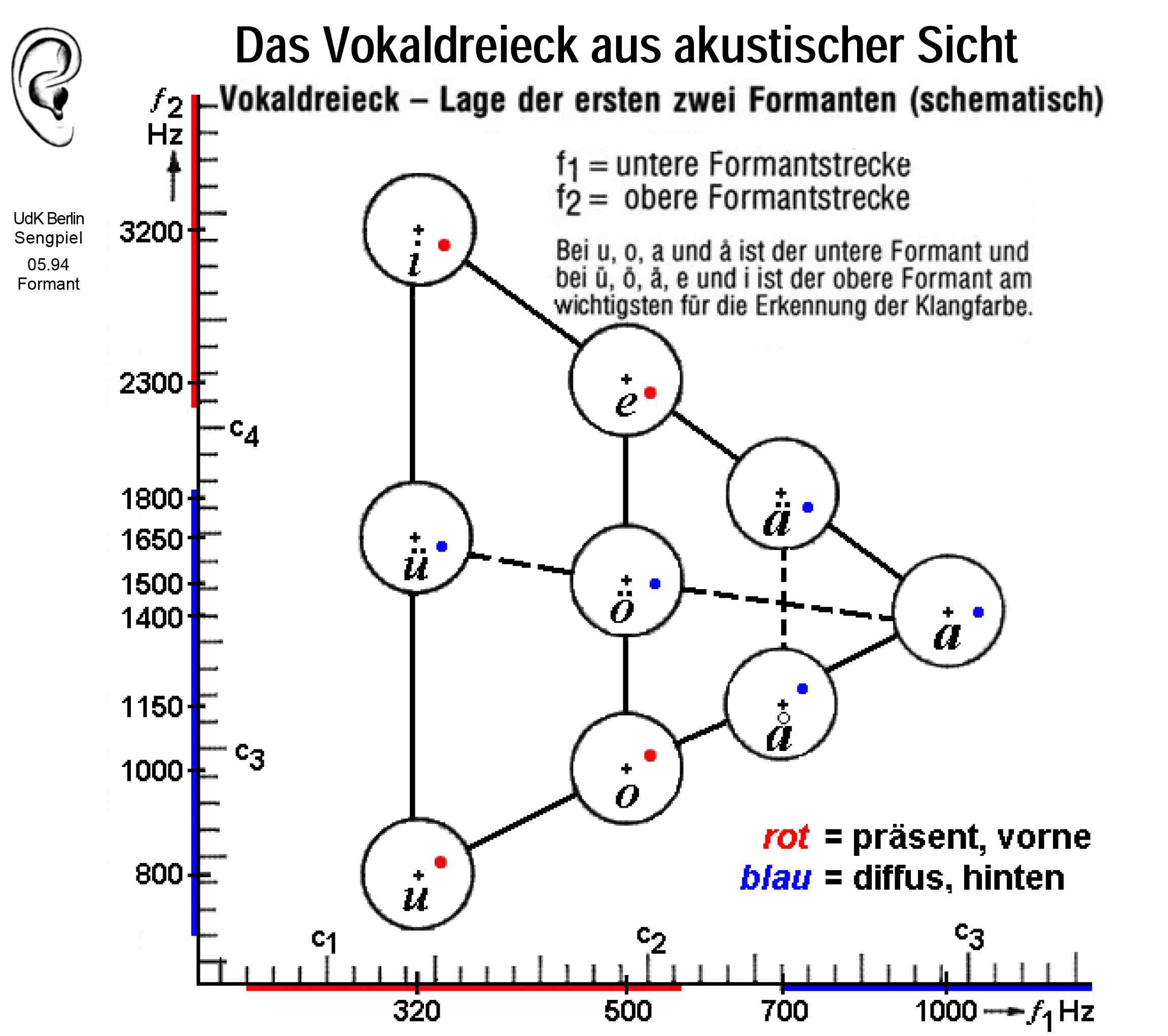 Für die Produktion der Vokale ist (neben den Lippen) in erster Linie die Zunge zuständig. Je nach Position der Zunge (hoch/tief und vorne/hinten) ergeben sich verschiedene Werte für die ersten beiden Formanten und damit auch verschiedene Vokale: