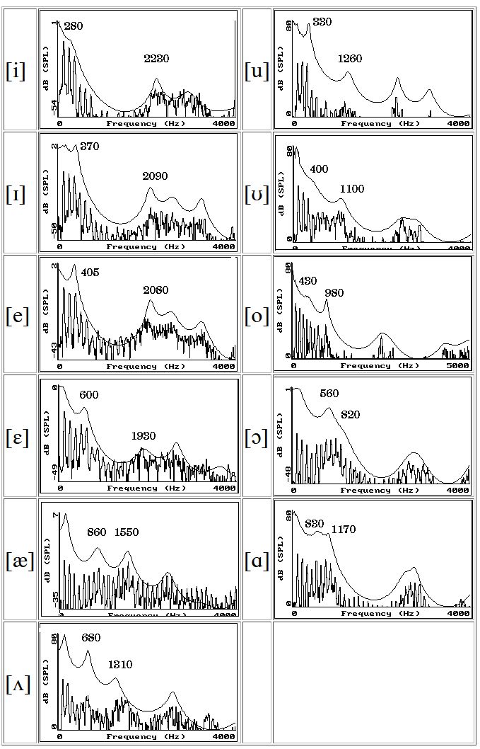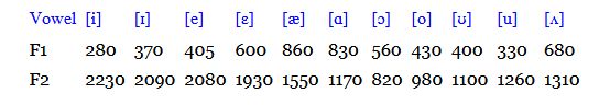 Die Formanten spielen eine wesentliche Rolle bei der Unterscheidung der Vokale. Vor allem die ersten beiden Formanten sind dabei von ausschlaggebender Bedeutung. Diese bezeichnet man auch als "Vokalformanten". Die folgende Tabelle zeigt die Frequenzzentren von F1 und F2 für die deutschen Vokale: