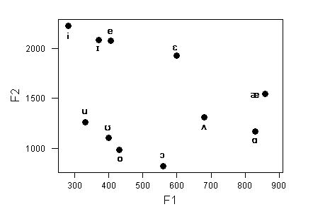 Eine etwas idealisierte Darstellung der ersten beiden Vokalformanten zeigt das sog. Vokaldreieck: