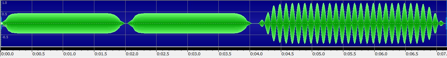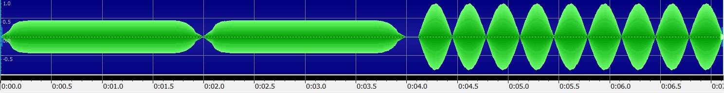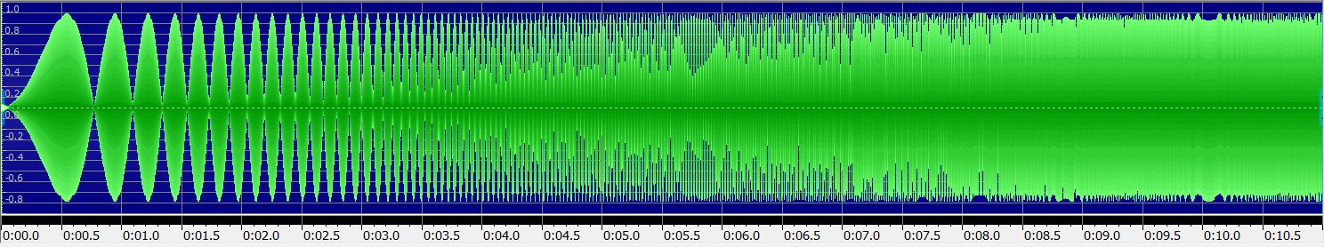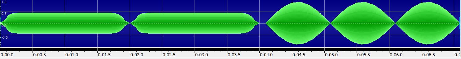 In unseren bisherigen Beispielen wurden Sinustöne verwendet. Hier treten bei unsauber intonierten Primen Schwebungen auf. Bei einer unsauber intonierten Oktave von Sinustönen entsteht so etwas: